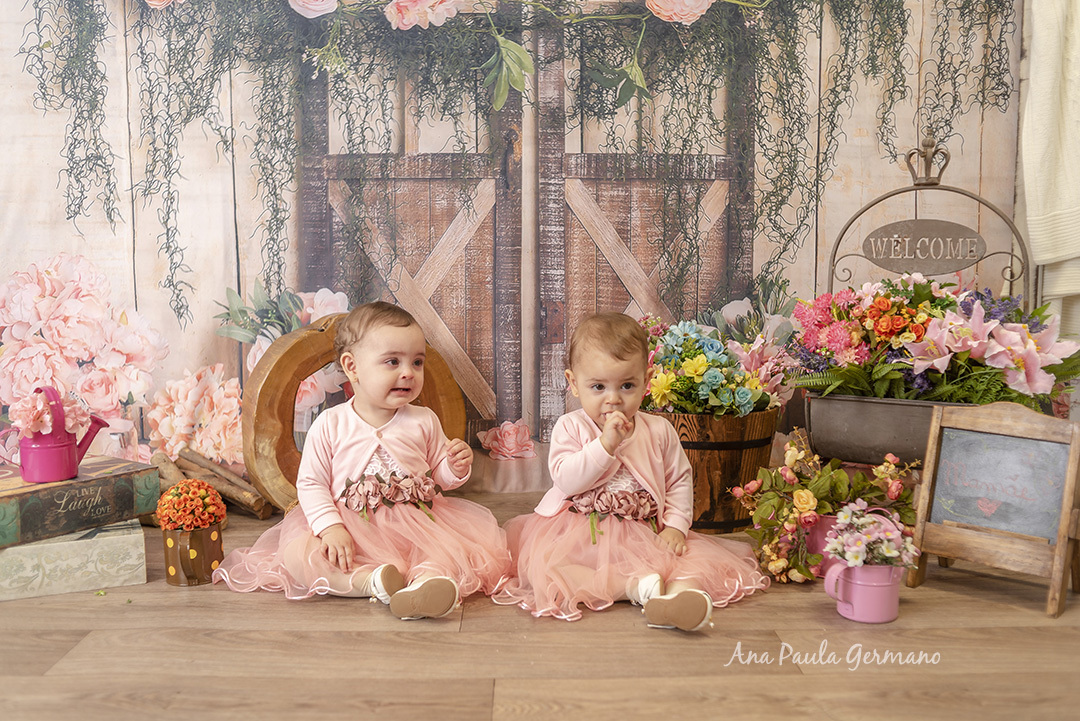 O ensaio de 11 meses das gêmeas Manuela e Rafaela foram temático para o Dia das Mães!
