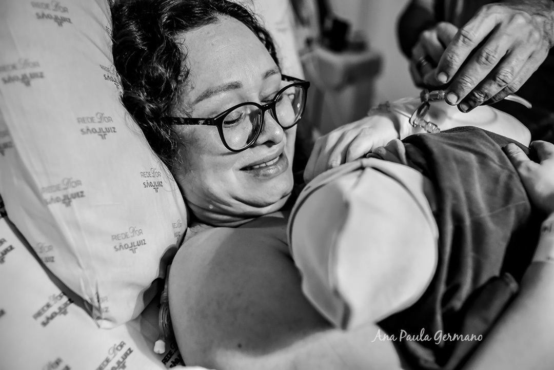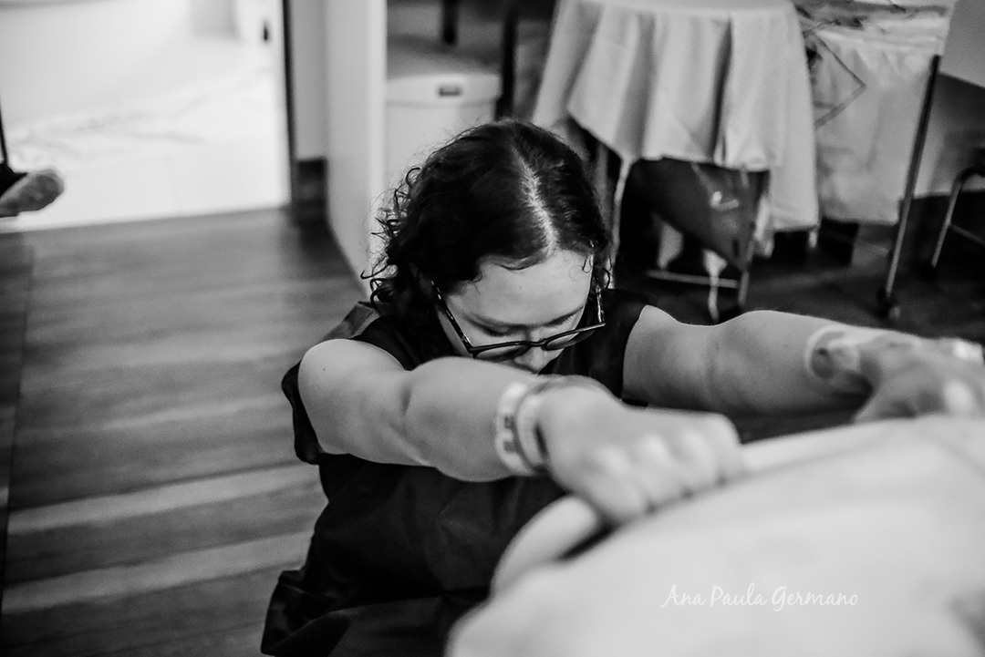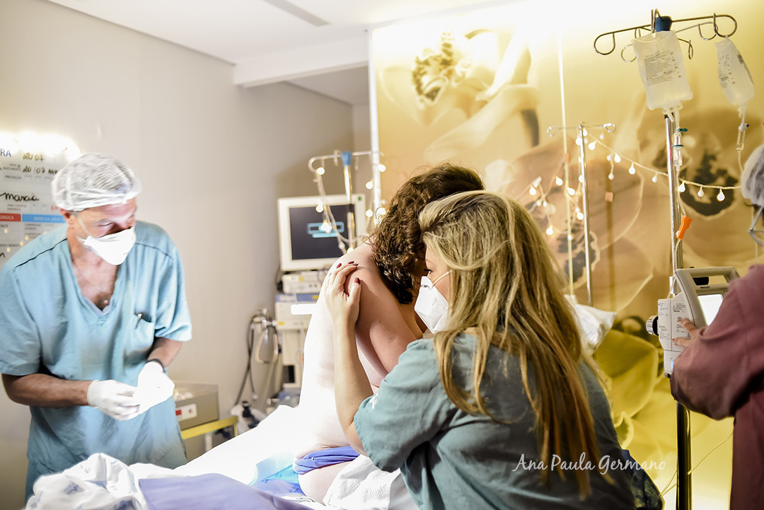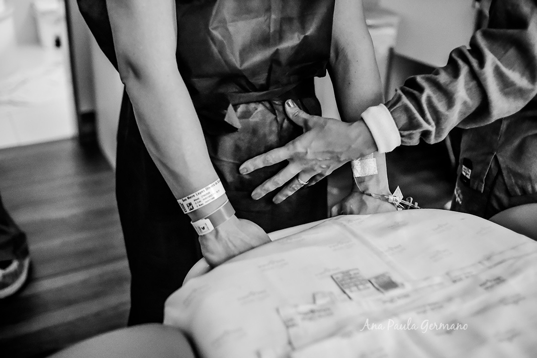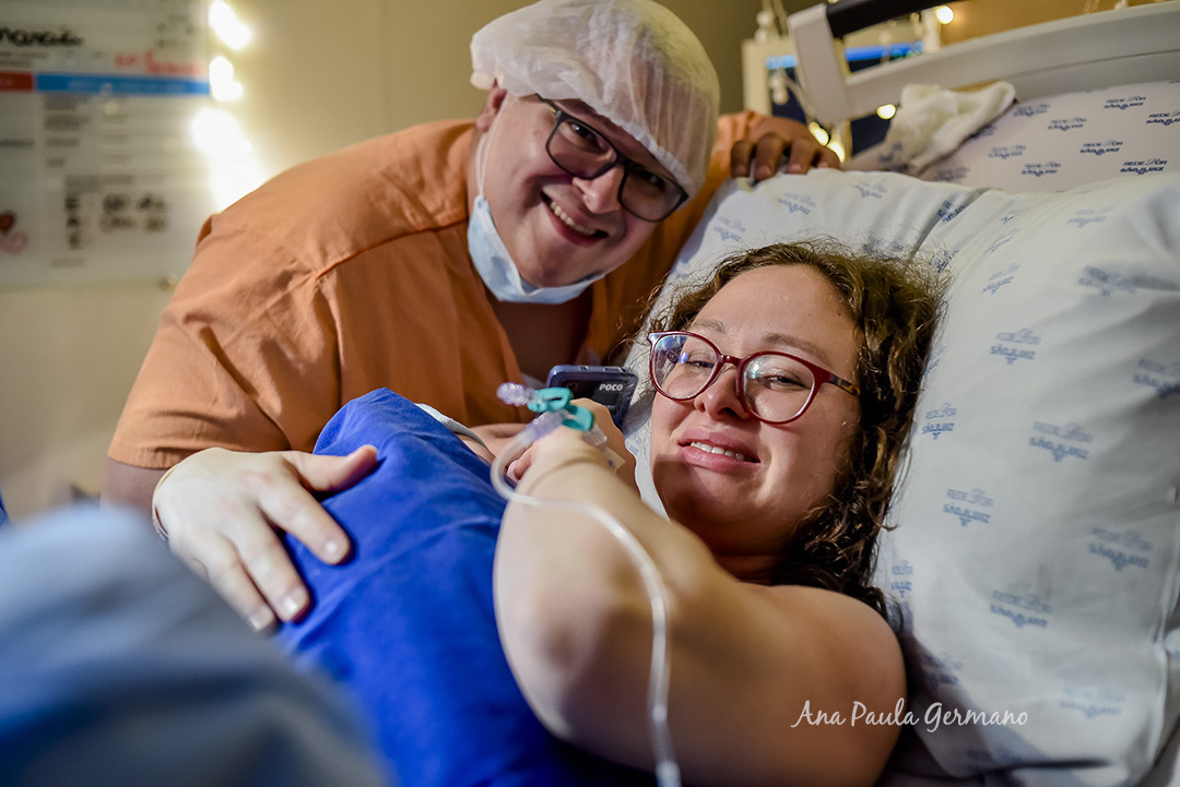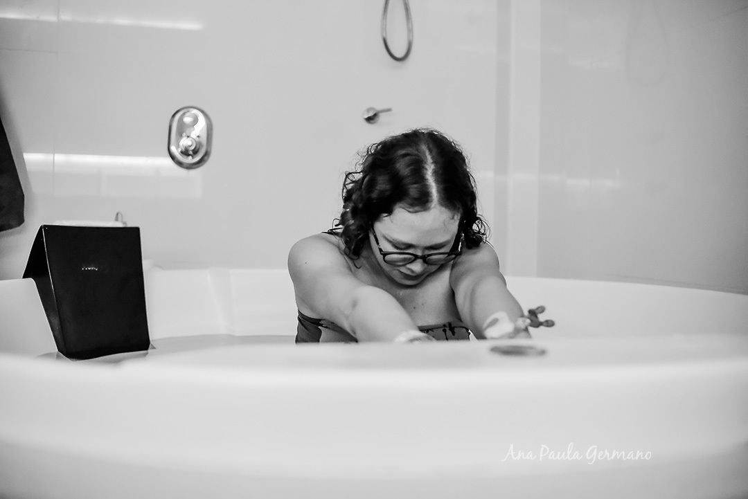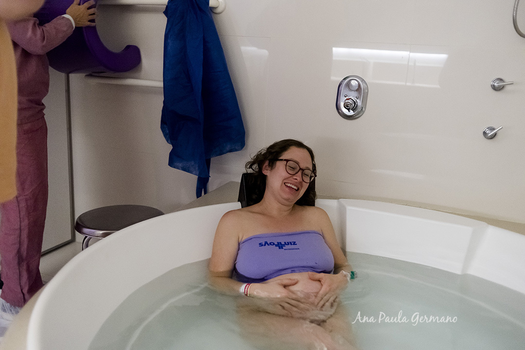 Sala liberada, ela foi para a banheira relaxar, quando a sua médica chegou, ela já estava com 8 dedos dilatação. Após avaliação, algumas massagens e alguns exercícios fora da banheira, ela voltou para a banheira para ficar mais um tempinho e, nesse momento, a bolsa rompeu. Nove dedos. Foi só a partir daí que as contrações e as dores se intensificaram e ela solicitou a analgesia.