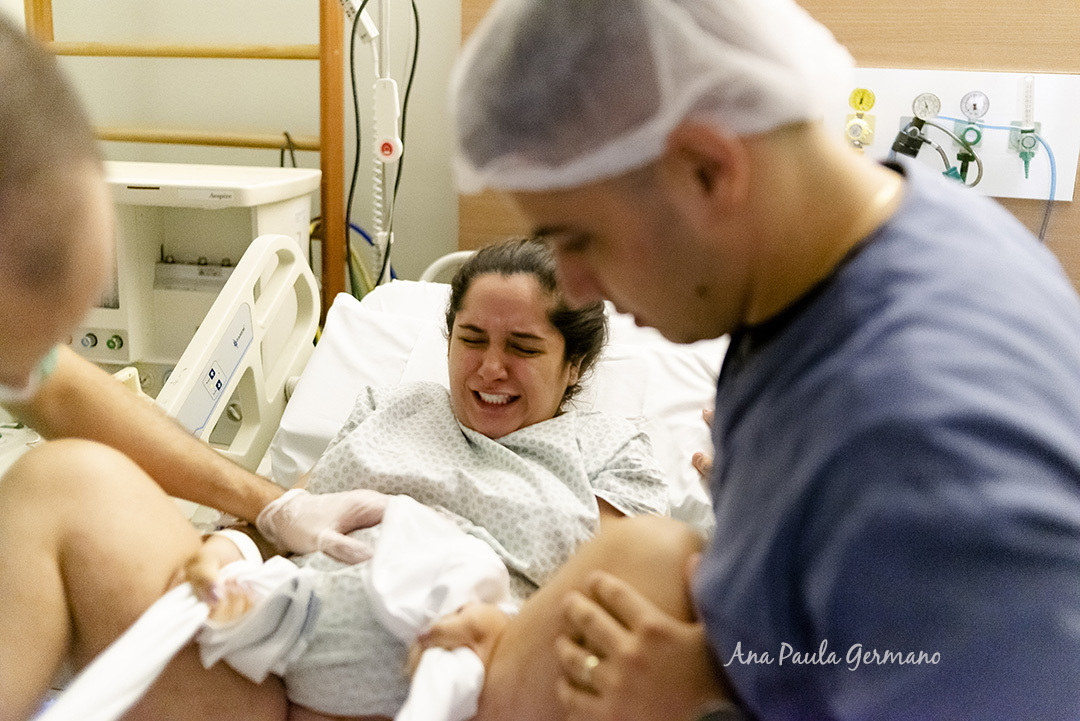 Chegando lá, ela já estava com contrações bem doloridas e bem ritmadas, aguardando uma sala para poder ficar mais confortável. E assim, foi. A doula sempre junto, o marido sempre acolhendo e apoiaando todas as decisões e segurando-a em todas as dores. Foi um processo longo, exaustivo, mas estremamente compensador e acolhedor. A equipe esteve com ela em todos os momentos, até que chegou a hora do expulsivo. A Maitê ainda estava alta e não descia e o tempo foi passando.